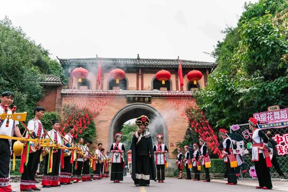 【可邑村】这个名字在彝族阿细语中意为“吉祥如意的地方”,正是阿细跳月的重要发祥地。它坐落在弥勒市北部,森林覆盖率高达百分之八十,距今已有360年历史。村落依山而建,呈团状布局,被当地人形象地称为“喜鹊窝”。走进可邑村,你会看见黑瓦黄墙的彝族传统民居错落有致地散布在山坡上,石板路被岁月磨得光滑,墙绘上描绘着阿细人耕织、歌舞的生活场景。